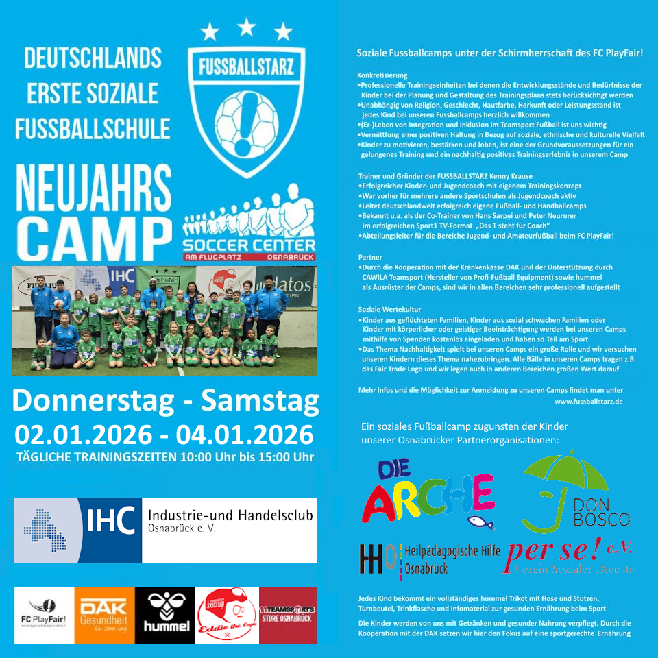 Vom 02.01. bis zum 04.01.2026 findet das FUSSBALLSTARZ Neujahrscamp für Kinder zwischen 6 - 12 Jahren im Soccer Center in Atter in Kooperation mit dem Bündnis für sozialen Sport statt.
